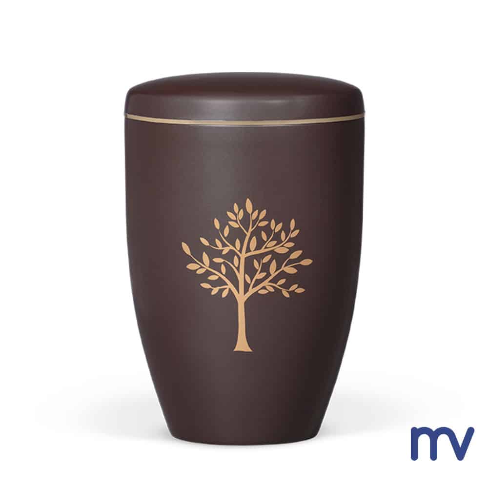 Stalen urne | Rookbruin, gouden lint, moderne boom